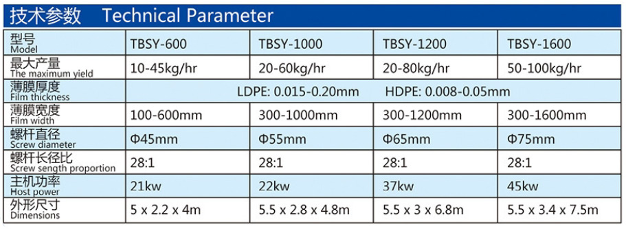 吹制各種規(guī)格的低密度聚乙烯、高密度聚乙烯和線性低密度聚乙烯塑料薄膜,廣泛應(yīng)用于食品百貨、日用、化工、針紡品、購物禮袋和工業(yè)包裝。機簡、螺桿采用38CrMoAl合金材料經(jīng)氮化處理精密加工而成,具有很好的耐磨和耐腐蝕性。